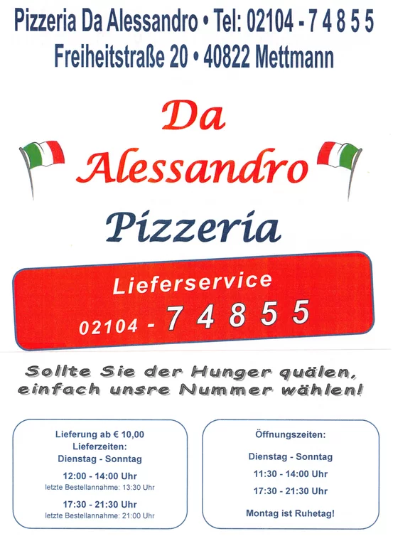 Sie suchen leckere Pizza in Mettmann mit schneller Lieferung? Dann sind Sie bei der Pizzeria Da Alessandro genau richtig. Unser Pizza-Lieferservice in Mettmann steht für köstliche Steinofenpizza, frisch zubereitet und ohne Blech, direkt auf dem Stein gebacken. Jede große Pizza mit 33 cm Durchmesser überzeugt durch knusprigen Boden, saftigen Belag und echten italienischen Geschmack. Ob klassisch oder individuell belegt – bei uns kommt Pizza heiß und frisch bei Ihnen an. Besonders attraktiv: kostenlose Lieferung bereits ab 10 Euro Bestellwert.